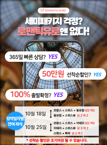 옵션 범벅된 무더기 패키지 상품 말고 2030만 모인 안전하고 알찬 자유여행을 원한다면? 매년 4천 명 이상이 선택한 로맨틱유로가 정답!�